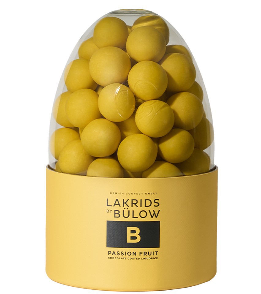 B - PASSION FRUIT, Süßer Lakritz mit erlesener weißer Schokolade und verführender Passionsfrucht. Die Säure der Passionsfrucht, die Süße der Schokolade und die Fähigkeit des Lakritzes, diese Aromen zu vereinen, gibt einen perfekten Biss. Süß, sauer und souverän - umgeben von einer zarten, knusprigen Zuckerschicht.