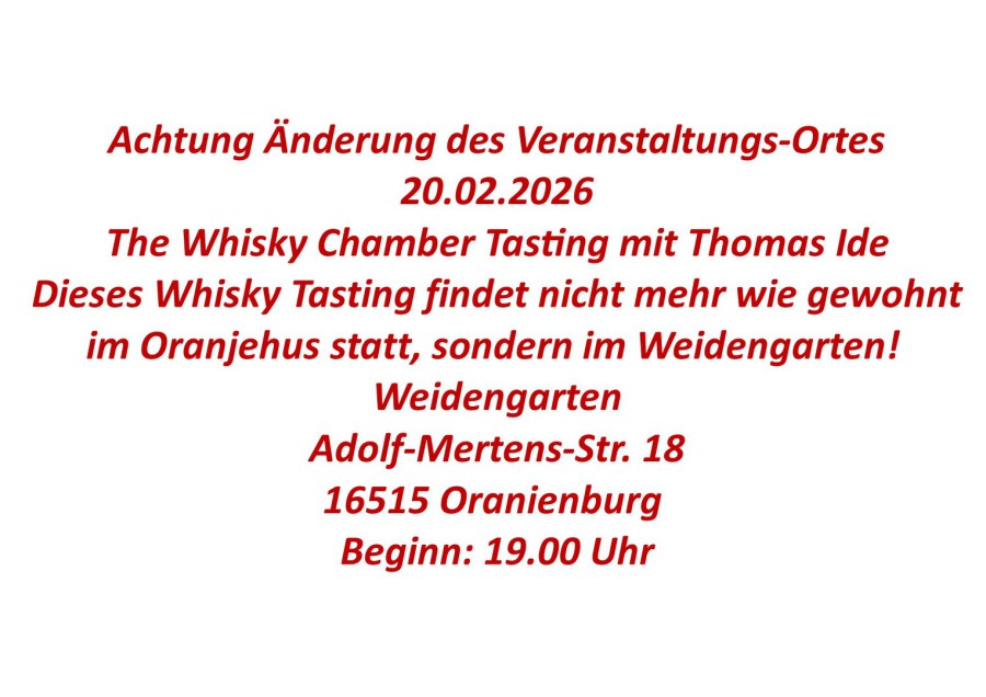 - Nähere Informationen über Ort und Zeitpunkt erhalten Sie auf unserer Homepage vom Whiskyland Oranienburg.